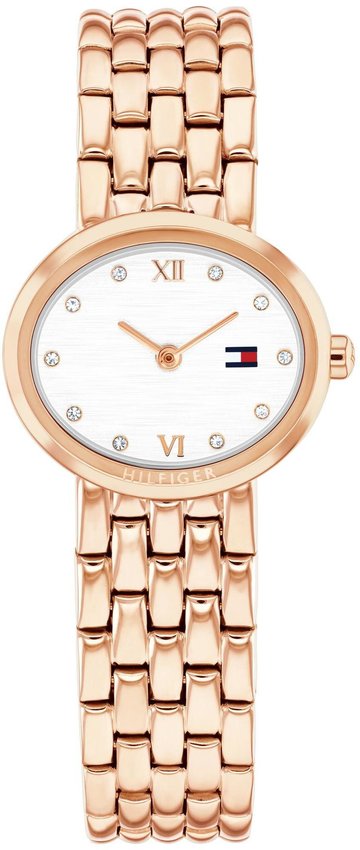 Zegarek damski 1782845 zalicza się do kolekcji Tommy Hilfiger Moira marki Tommy Hilfiger. Styl zapewnia wysokiej klasy tarcza w kolorze białym. Pokazana metodą analogową bieżąca godzina jest czytelna i prosta do odczytania. Koperta w odcieniach koloru różowo złotego o grubości 7 mm - wyróżnia się owalnym kształtem.