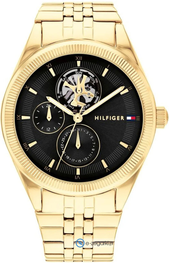 Zegarek 1782717 marki Tommy Hilfiger to gustowny zegarek naręczny damski, który posiada pomysłowe rozwiązania oraz funkcje. Model ten występuje w kolekcji Tommy Hilfiger Monica Le. Ciekawą budowę zegarka osiągnięto z pomocą tarczy w kolorze czarnym. Pokazana metodą analogową bieżąca godzina jest czytelna i szybka do odczytania. Koperta jest w kolorze złotym szeroka jest na 38 mm oraz ma grubość 9 mm - charakteryzuje się okrągłym kształtem.