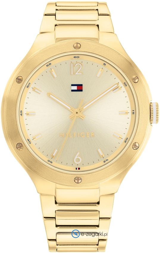 Zegarek damski 1782477 marki Tommy Hilfiger to dobra pozycja dla osób ceniących sobie dbałość o detale a także bezawaryjne zachowanie mechanizmów. Atrakcyjny wygląd zegarka uzyskano również dzięki tarczy w kolorze beżowym. Zaprezentowana metodą analogową aktualna godzina jest czytelna i prosta do sprawdzenia. Koperta została ozdobiona kolorem złotym szeroka jest na 38 mm - cechuje się okrągłym kształtem.