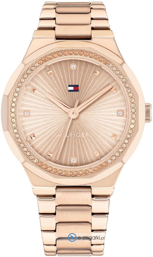 Zegarek damski 1782726 marki Tommy Hilfiger to stylowe połączenie funkcjonalności a także modnego wzornictwa. Model ten w gamie innych zegarków tego producenta występuje w kolekcji Tommy Hilfiger Piper. Ciekawy wygląd czasomierza osiągnięto także dzięki tarczy w kolorze złotym. Zegarek ten pokazuje godzinę w formacie analogowym dzięki temu odczyt jest bezproblemowy. Koperta została ozdobiona kolorem złotym szeroka jest na 36 mm oraz ma grubość 9 mm - ma okrągły kształt.