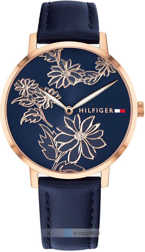 Model damski 1781918 należy do kolekcji Tommy Hilfiger Pippa marki Tommy Hilfiger. Charakteru nadaje wysokiej klasy cyferblat w kolorze granatowym. Pokazana metodą analogową aktualna godzina jest czytelna i prosta do sprawdzenia. Koperta została pokryta kolorem różowo złotym szeroka jest na 35 mm oraz ma grubość 6 mm - posiada okrągły kształt.