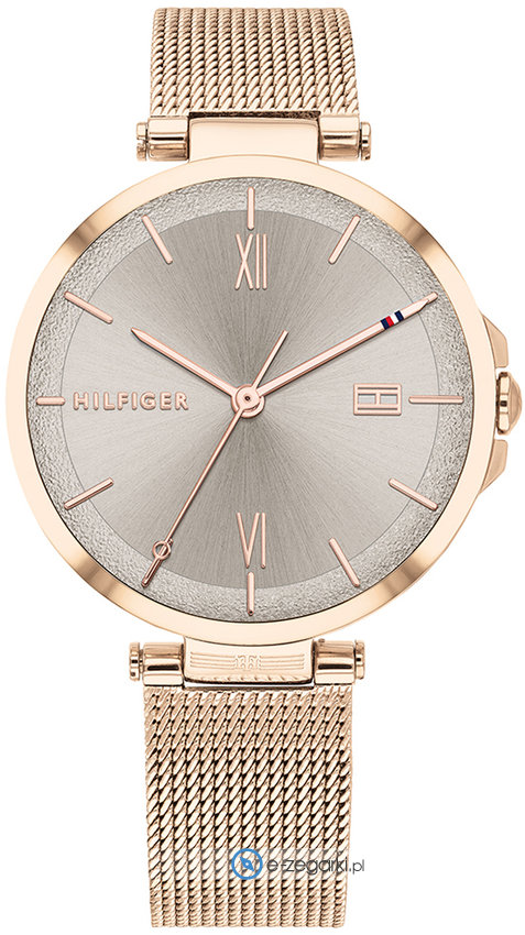 Damski zegarek 1782208 z serii Tommy Hilfiger Reade marki Tommy Hilfiger to połączenie smaku i nowatorskich mechanizmów. Wysokiej trwałości tarczę zegarka pokryto szarym kolorem. Zegarek ten pokazuje aktualny czas w formacie analogowym dzięki czemu odczyt jest bardzo łatwy. Koperta jest ozdobiona kolorem różowo złotym szeroka jest na 34 mm oraz ma grubość 7 mm - ma okrągły kształt.