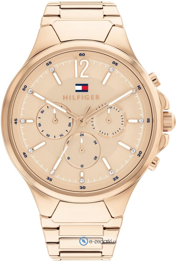 Zegarek 1782597 marki Tommy Hilfiger to gustowny zegarek naręczny damski, który posiada pomysłowe rozwiązania oraz funkcje. Model ten jest z serii Tommy Hilfiger Sienna. Cyferblat zegarka jest w kolorze różowo złotym. Zegarek ten pokazuje godzinę w formacie analogowym dzięki czemu odczyt jest intuicyjny. Koperta została ozdobiona kolorem różowo złotym szeroka jest na 40 mm - w kształcie okrągłym.