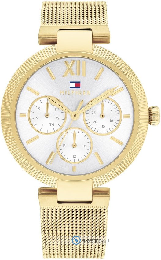 Damski zegarek 1782694 z kolekcji Tommy Hilfiger Sophia marki Tommy Hilfiger to połączenie smaku oraz pomysłowych mechanizmów. Styl zapewnia wysokiej klasy tarcza w kolorze srebrnym. Godzina przedstawiona jest w sposób analogowy co intuicyjnie pozwala ją odczytać. Koperta w barwach koloru złotego szeroka jest na 36 mm oraz ma grubość 8 mm - posiada okrągły kształt.