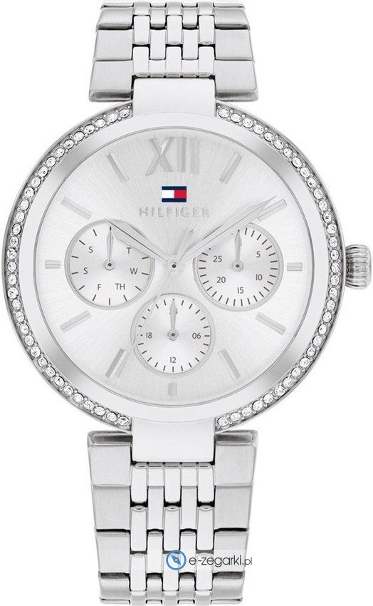 Zegarek damski 1782695 marki Tommy Hilfiger to stylowe połączenie funkcjonalności a także modnego wzornictwa. Model ten w gamie pozostałych zegarków tego producenta występuje w kolekcji Tommy Hilfiger Sophia. Wysokiej jakości tarczę zegarka ozdobiono srebrnym kolorem. Zaprezentowana metodą analogową bieżąca godzina jest czytelna i prosta do sprawdzenia. Koperta została ozdobiona kolorem srebrnym szeroka jest na 36 mm oraz ma grubość 8 mm - posiada okrągły kształt.
