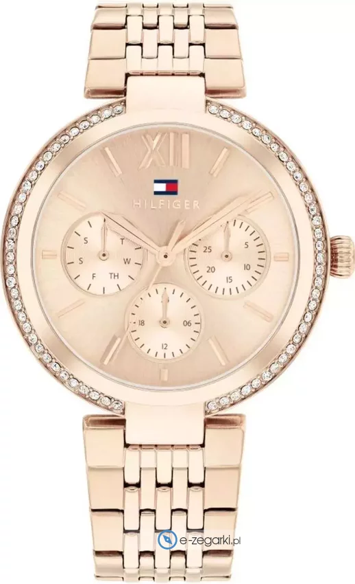 Tommy Hilfiger 1782696 to damski zegarek przeznaczony dla osób szukających zegarka z kolekcji Tommy Hilfiger Sophia. Tarcza zegarka jest w kolorze różowo złotym. Godzina prezentowana jest w sposób analogowy co bez trudu pozwala ją odczytać. Koperta została ozdobiona kolorem różowo złotym szeroka jest na 36 mm oraz ma grubość 8 mm - ma okrągły kształt.