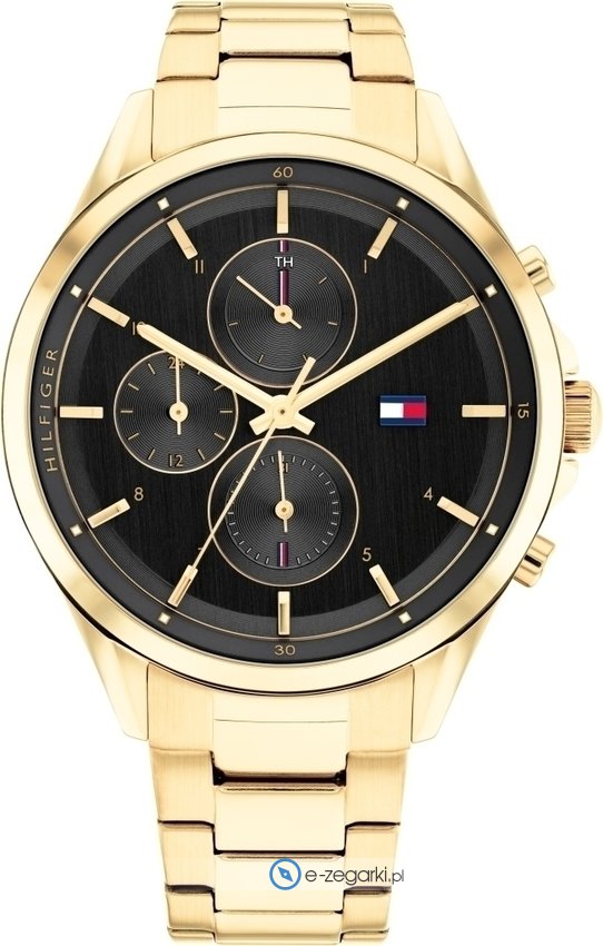 Damski zegarek Tommy Hilfiger 1782423 to zegarek, który dzięki swemu wzornictwu zawsze będzie prezentował się dobrze. Nieschematyczny wygląd zegarka uzyskano m.in. poprzez cyferblat w kolorze czarnym. Zegarek ten prezentuje aktualny czas w formacie analogowym dzięki czemu odczyt jest bardzo łatwy. Koperta jest w kolorze złotym szeroka jest na 38 mm oraz ma grubość 9 mm - w kształcie okrągłym.