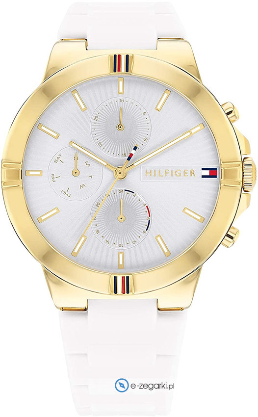 Zegarek damski 1782333 marki Tommy Hilfiger to stylowe połączenie funkcjonalności a także modnego wzornictwa. Model ten jest z serii Tommy Hilfiger Talia. Charakterystyczną budowę zegarka osiągnięto dzięki tarczy w kolorze szarym. Aktualna godzina pokazywana jest w sposób analogowy co bez trudu pozwala ją odczytać. Koperta jest w kolorze złotym szeroka jest na 38 mm oraz ma grubość 9 mm - posiada okrągły kształt.