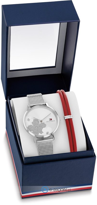 Damski zegarek 2770155 z serii Tommy Hilfiger Tea Le marki Tommy Hilfiger to połączenie estetyki i oryginalnych funkcji. Wysokiej jakości tarczę zegarka ozdobiono srebrnym kolorem. Aktualna godzina zaprezentowana jest w sposób analogowy co bez trudu pozwala ją odczytać. Koperta jest w kolorze srebrnym szeroka jest na 35 mm - w kształcie okrągłym.