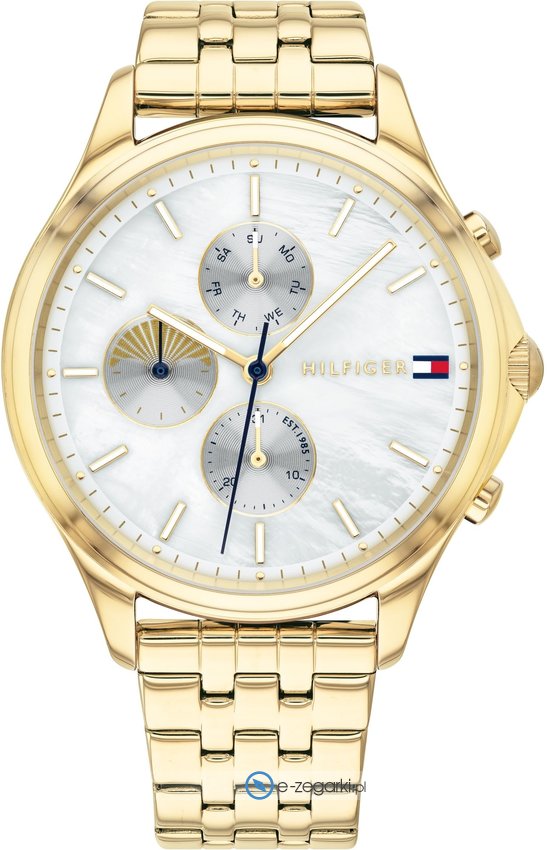 Zegarek damski 1782121 marki Tommy Hilfiger to dobre połączenie funkcjonalności a także ciekawego wzornictwa. Charakterystyczną budowę czasomierza uzyskano dzięki tarczy w kolorze szarym. Zaprezentowana metodą analogową aktualna godzina jest czytelna i prosta do odczytania. Koperta została pokryta kolorem złotym - wyróżnia się okrągłym kształtem.