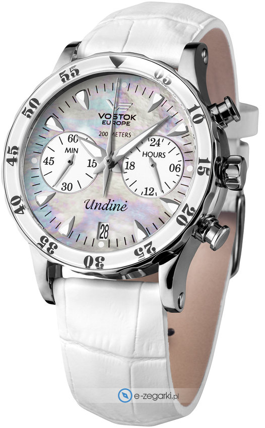 Model damski VK64-515A671 marki Vostok Europe z serii Vostok Europe Undine. Aktualna godzina pokazywana jest w sposób analogowy co intuicyjnie pozwala ją odczytać. Koperta w barwach koloru srebrnego szeroka jest na 39 mm oraz ma grubość 14 mm - w kształcie okrągłym.