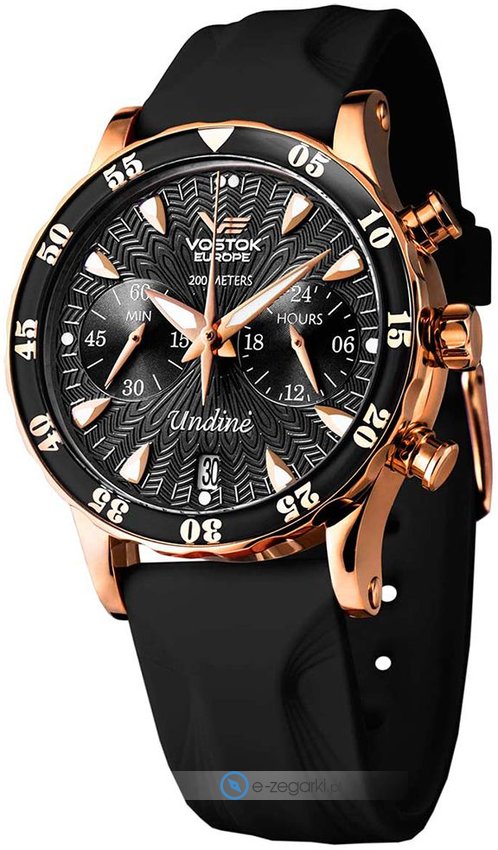 Vostok Europe VK64-515B568 - damski zegarek kierowany dla osób szukających zegarka z serii Vostok Europe Undine. Niebanalną budowę zegarka osiągnięto z pomocą tarczy w kolorze czarnym. Pokazana metodą analogową aktualna godzina jest czytelna i prosta do sprawdzenia. Koperta szeroka jest na 39 mm oraz ma grubość 13.5 mm - w kształcie okrągłym.
