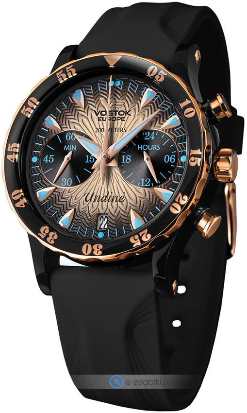 Zegarek damski VK64-515E627 marki Vostok Europe to stylowe połączenie funkcjonalności i modnego designu. Model ten jest z kolekcji Vostok Europe Undine. Godzina zaprezentowana jest w sposób analogowy co intuicyjnie pozwala ją odczytać. Koperta w barwach koloru czarnego szeroka jest na 39 mm oraz ma grubość 13 mm - w kształcie okrągłym.