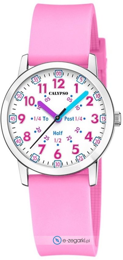 Zegarek dziecięcy K5825-2 marki Calypso to dobra pozycja dla ludzi ceniących sobie dbałość o detale jak również bezawaryjne zachowanie mechanizmów. Wysokiej trwałości cyferblat zegarka pokryto białym kolorem. Godzina zaprezentowana jest w sposób analogowy co intuicyjnie pozwala ją odczytać. Koperta szeroka jest na 30 mm - cechuje się okrągłym kształtem.