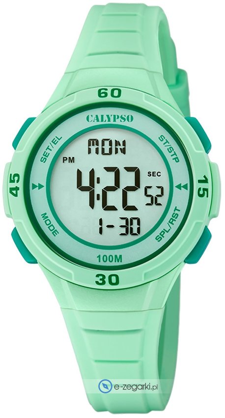 Model K5830-1 marki Calypso to elegancki zegarek naręczny dziecięcy, który wyposażono w pomysłowe rozwiązania i funkcje. Wysokiej jakości cyferblat zegarka ozdobiono zielonym kolorem. Godzina przedstawiona jest w sposób cyfrowy co intuicyjnie pozwala ją odczytać. Koperta szeroka jest na 35 mm - w kształcie okrągłym.