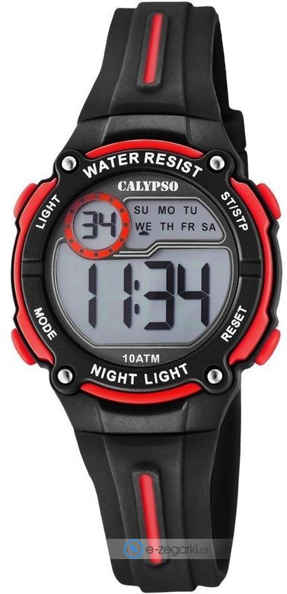 Model K6068-6 marki Calypso to gustowny zegarek naręczny dziecięcy, który wyposażono w ciekawe rozwiązania i funkcje. Tarcza zegarka w kolorze czarnym. Zegarek ten pokazuje aktualny czas w formacie cyfrowym dzięki temu odczyt jest bardzo łatwy. Koperta szeroka jest na 32 mm - wyróżnia się okrągłym kształtem.