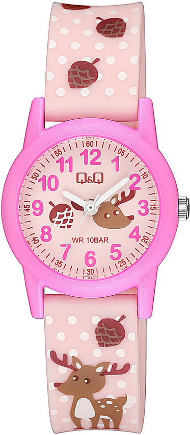 Model V22A-015V marki Q&Q to stylowy zegarek naręczny dziecięcy, który wyposażono w ciekawe rozwiązania oraz funkcje. Niestereotypowy wygląd zegarka uzyskano m.in. poprzez tarczę w kolorze różowym. Zegarek ten prezentuje aktualny czas w formacie analogowym dzięki temu odczyt jest bardzo łatwy. Koperta została pokryta kolorem różowym szeroka jest na 31 mm oraz ma grubość 10 mm - wyróżnia się okrągłym kształtem.
