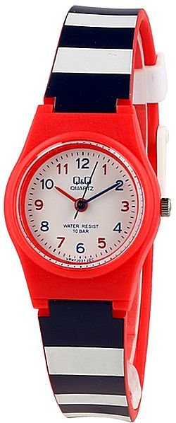 Zegarek dziecięcy VP47-031 marki Q&Q to dobre połączenie funkcjonalności a także modnego wzornictwa. Atrakcyjny wygląd zegarka uzyskano również dzięki tarczy w kolorze białym. Zaprezentowana metodą analogową bieżąca godzina jest czytelna i łatwa do odczytania. Koperta jest w kolorze czerwonym szeroka jest na 24 mm oraz ma grubość 85 mm - w kształcie okrągłym.