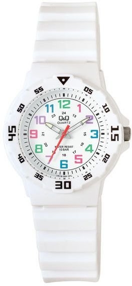 Model VR19-004 marki Q&Q to stylowy zegarek naręczny dziecięcy, który posiada ciekawe rozwiązania i funkcje. Ciekawą konstrukcję czasomierza uzyskano dzięki tarczy w kolorze białym. Koperta jest w kolorze białym.