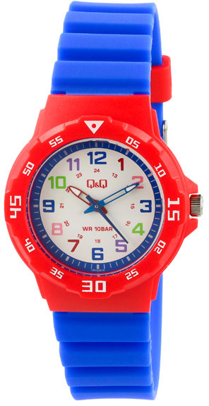 Model VR19-010 marki Q&Q to gustowny zegarek naręczny dziecięcy, który jest wyposażony w ciekawe rozwiązania oraz funkcje. Niebanalny wygląd czasomierza uzyskano również dzięki tarczy w kolorze białym. Aktualna godzina zaprezentowana jest w sposób analogowy co intuicyjnie pozwala ją odczytać. Koperta w barwach koloru czerwonego szeroka jest na 33 mm oraz ma grubość 9.70 mm - w kształcie okrągłym.