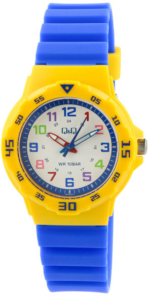 Model VR19-011 marki Q&Q to gustowny zegarek naręczny dziecięcy, który posiada ciekawe rozwiązania i funkcje. Charakterystyczny wygląd czasomierza osiągnięto także dzięki tarczy w kolorze białym. Godzina przedstawiona jest w sposób analogowy co intuicyjnie pozwala ją odczytać. Koperta jest w kolorze żółtym szeroka jest na 33 mm oraz ma grubość 9.70 mm - ma okrągły kształt.