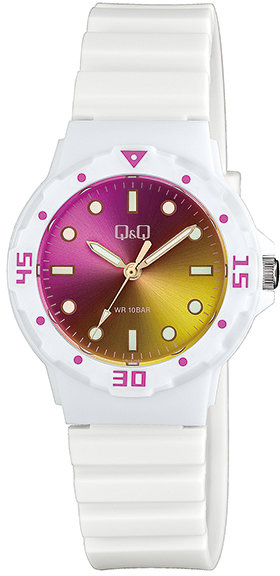 Model VR19-024 marki Q&Q to elegancki zegarek naręczny dziecięcy, który jest wyposażony w pomysłowe rozwiązania oraz funkcje. Godzina zaprezentowana jest w sposób analogowy co intuicyjnie pozwala ją odczytać. Koperta w odcieniach koloru białego szeroka jest na 33 mm oraz ma grubość 9.25 mm - cechuje się okrągłym kształtem.