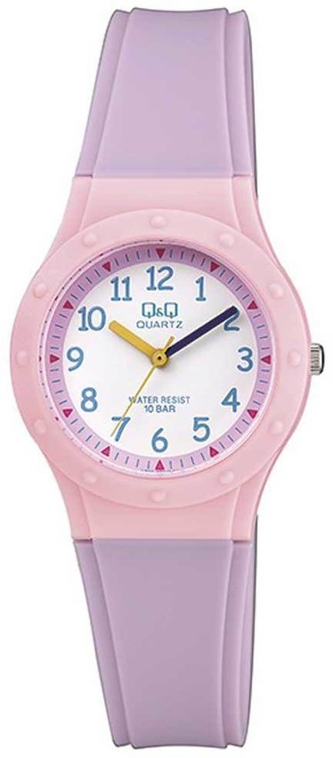 Zegarek dziecięcy VR75-002 marki Q&Q to stylowe połączenie funkcjonalności a także modnego wzornictwa. Ciekawy wygląd czasomierza osiągnięto także dzięki tarczy w kolorze białym. Godzina zaprezentowana jest w sposób analogowy co bez trudu pozwala ją odczytać. Koperta jest w kolorze różowym szeroka jest na 31 mm oraz ma grubość 9 mm - posiada okrągły kształt.