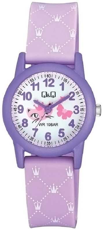 Zegarek dziecięcy VR99-014 marki Q&Q to idealne połączenie funkcjonalności i ciekawego designu. Aktualna godzina prezentowana jest w sposób analogowy co intuicyjnie pozwala ją odczytać. Koperta w barwach koloru fioletowego szeroka jest na 30 mm oraz ma grubość 10 mm - posiada okrągły kształt.