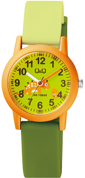 Zegarek dziecięcy VS49-008 marki Q&Q to dobre połączenie funkcjonalności a także modnego designu. Atrakcyjny wygląd zegarka uzyskano także dzięki tarczy w kolorze zielonym. Godzina zaprezentowana jest w sposób analogowy co intuicyjnie pozwala ją odczytać. Koperta została pokryta kolorem pomarańczowym o grubości 10 mm - cechuje się okrągłym kształtem.