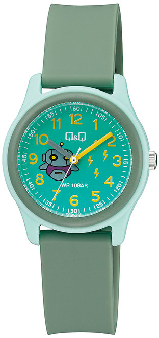 Model VS59-006 marki Q&Q to stylowy zegarek naręczny dziecięcy, który posiada pomysłowe rozwiązania oraz funkcje. Stylu nadaje wysokiej jakości cyferblat w kolorze zielonym. Aktualna godzina zaprezentowana jest w sposób analogowy co bez trudu pozwala ją odczytać. Koperta jest pokryta kolorem zielonym szeroka jest na 32 mm oraz ma grubość 10 mm - w kształcie okrągłym.