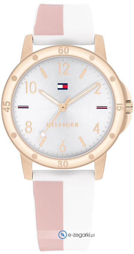 Zegarek dziecięcy 1720015 marki Tommy Hilfiger to stylowe połączenie funkcjonalności a także modnego wzornictwa. Model ten jest z serii Tommy Hilfiger Kids. Nieschematyczny wygląd zegarka osiągnięto także dzięki tarczy w kolorze białym. Pokazana metodą analogową bieżąca godzina jest czytelna i prosta do odczytania. Koperta jest w kolorze różowo złotym szeroka jest na 32 mm oraz ma grubość 8 mm - posiada okrągły kształt.