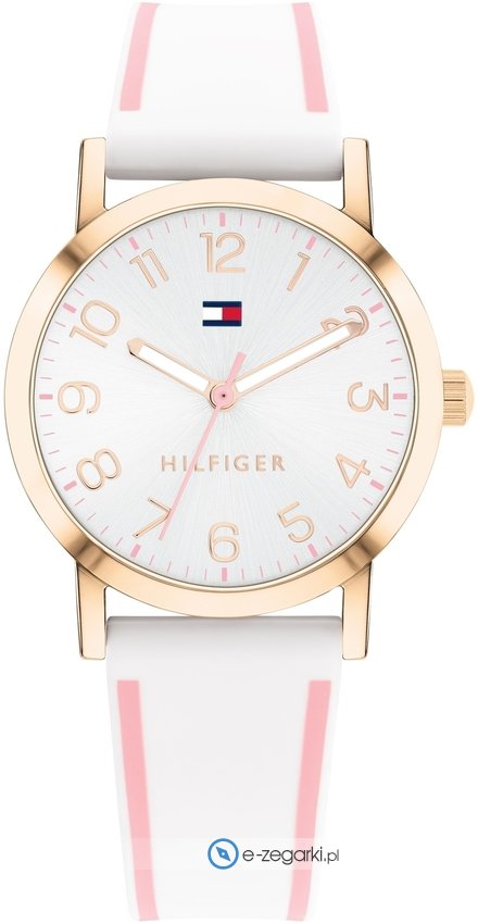 Tommy Hilfiger 1720023 to dziecięcy zegarek kierowany dla osób szukających zegarka z serii Tommy Hilfiger Kids. Charakter zapewnia wysokiej klasy cyferblat w kolorze białym. Aktualna godzina prezentowana jest w sposób analogowy co niezmiernie łatwo pozwala ją odczytać. Koperta w barwach koloru różowo złotego szeroka jest na 30 mm - w kształcie okrągłym.