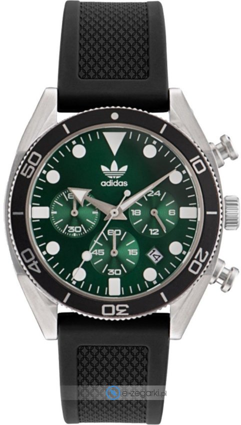 Zegarek męski AOFH23005 marki Adidas to dobra pozycja dla osób ceniących sobie dbałość o detale jak również bezawaryjne działanie mechanizmów. Nieschematyczny wygląd zegarka uzyskano również dzięki tarczy w kolorze zielonym. Godzina prezentowana jest w sposób analogowy co niezmiernie łatwo pozwala ją odczytać. Koperta jest w kolorze szarym szeroka jest na 43 mm oraz ma grubość 11 mm - ma okrągły kształt.