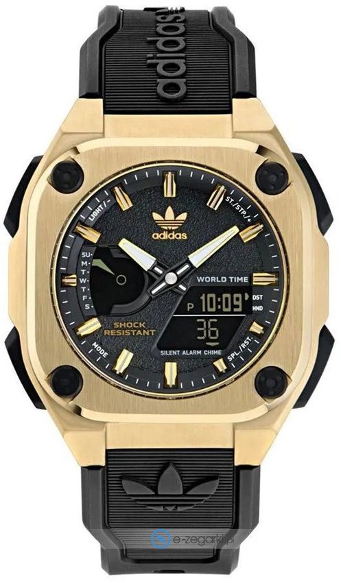 Męski zegarek Adidas AOFH23501 to zegarek, który dzięki swemu wzornictwu zawsze będzie prezentował się dobrze. Charakter zapewnia wysokiej jakości tarcza w kolorze czarnym. Aktualna godzina przedstawiona jest w sposób analogowo - cyfrowy co bez trudu pozwala ją odczytać. Koperta w barwach koloru złotego szeroka jest na 45 mm oraz ma grubość 13 mm - charakteryzuje się okrągłym kształtem.