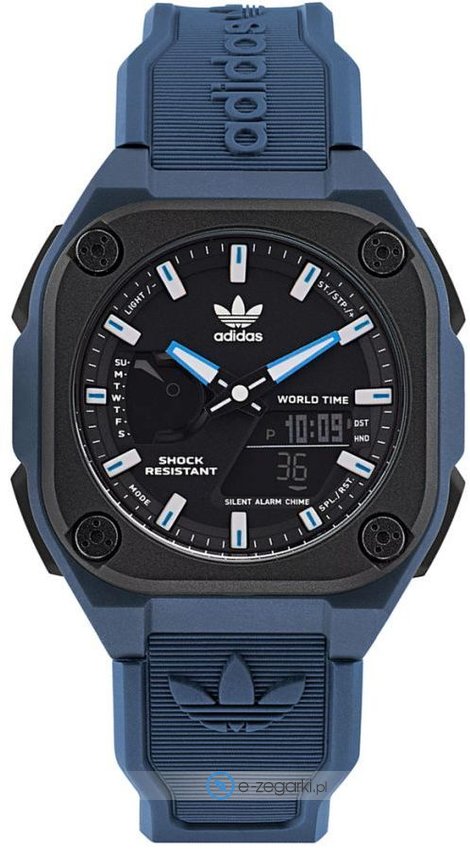 Zegarek męski AOST22545 marki Adidas to ciekawa pozycja dla osób ceniących sobie dbałość o szczegóły a także bezawaryjne działanie mechanizmów. Niebanalną stylistykę zegarka osiągnięto dzięki tarczy w kolorze czarnym. Zegarek ten pokazuje godzinę w formacie analogowo - cyfrowym dzięki temu odczyt jest bezproblemowy. Koperta została ozdobiona kolorem czarnym szeroka jest na 45 mm oraz ma grubość 15 mm.