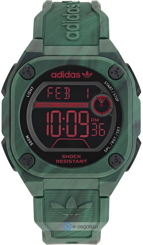 Model AOST23573 marki Adidas to gustowny zegarek naręczny męski, który wyposażono w pomysłowe rozwiązania i funkcje. Pokazana metodą cyfrową bieżąca godzina jest czytelna i prosta do odczytania. Koperta jest pokryta kolorem zielonym szeroka jest na 45 mm oraz ma grubość 13 mm.