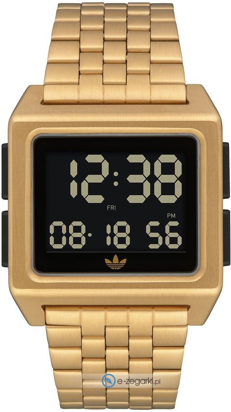 Model męski Z01-513 marki Adidas należy do kolekcji Adidas Archive M1. Cyferblat zegarka w kolorze ciemnym. Zegarek ten prezentuje godzinę w formacie cyfrowym dzięki czemu odczyt jest intuicyjny. Koperta w odcieniach koloru złotego szeroka jest na 36 mm oraz ma grubość 9 mm - cechuje się prostokątnym kształtem.