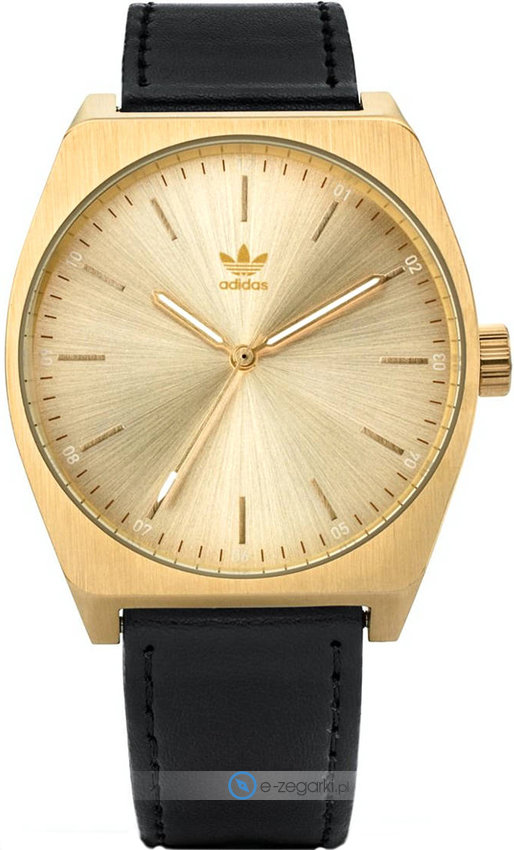 Męski zegarek Z05-510 z serii Adidas Process L1 marki Adidas to połączenie smaku oraz oryginalnych mechanizmów. Niestereotypowy wygląd czasomierza osiągnięto m.in. poprzez cyferblat w kolorze złotym. Aktualna godzina pokazywana jest w sposób analogowy co intuicyjnie pozwala ją odczytać. Koperta w barwach koloru złotego szeroka jest na 38 mm oraz ma grubość 9 mm - w kształcie okrągłym.