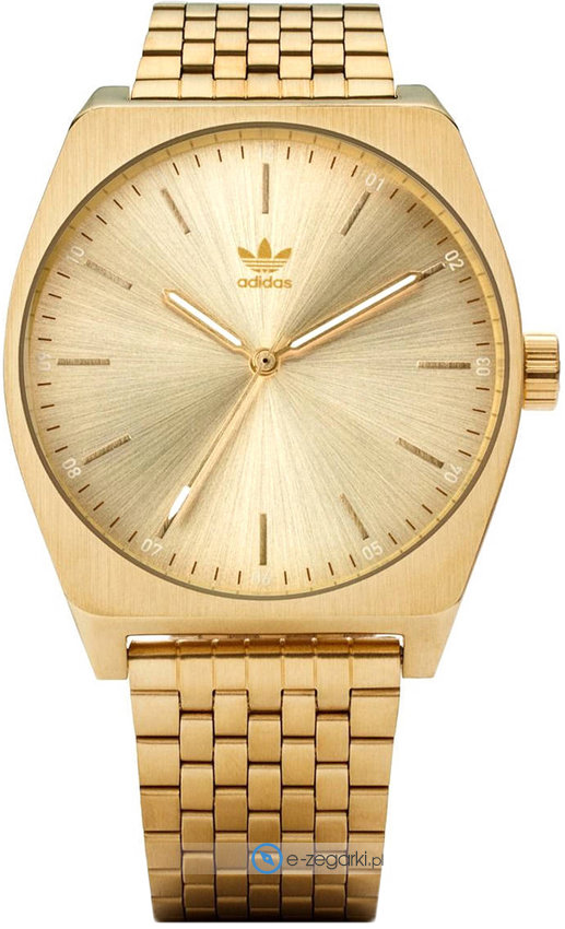 Zegarek męski Z02-502 marki Adidas to dobre połączenie funkcjonalności oraz modnego wzornictwa. Model ten w gamie innych zegarków tego producenta występuje w serii Adidas Process M1. Wysokiej trwałości cyferblat zegarka pokryto złotym kolorem. Godzina zaprezentowana jest w sposób analogowy co intuicyjnie pozwala ją odczytać. Koperta jest ozdobiona kolorem złotym szeroka jest na 38 mm oraz ma grubość 9 mm - posiada okrągły kształt.
