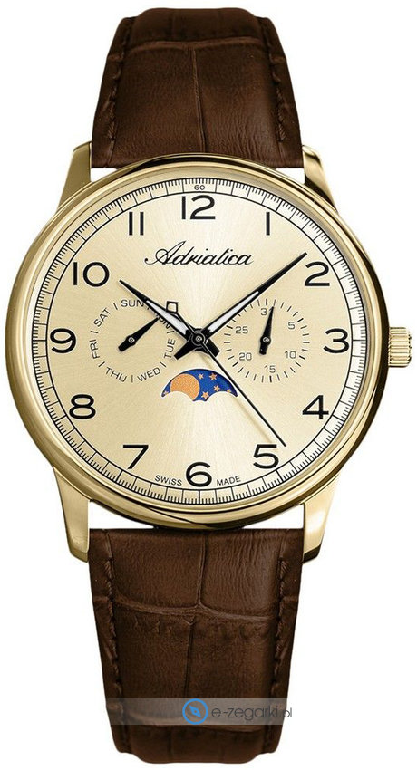 Model A8243.1221QF marki Adriatica to gustowny zegarek naręczny męski, który wyposażono w ciekawe rozwiązania i funkcje. Atrakcyjną stylistykę zegarka uzyskano dzięki tarczy w kolorze złotym. Zaprezentowana metodą analogową bieżąca godzina jest czytelna i łatwa do sprawdzenia. Koperta w barwach koloru złotego szeroka jest na 40 mm oraz ma grubość 10 mm - w kształcie okrągłym.