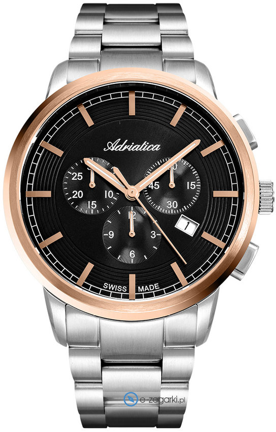 Model A8307.R1R6CH marki Adriatica to elegancki zegarek naręczny męski, który posiada ciekawe rozwiązania i funkcje. Charakterystyczną konstrukcję czasomierza osiągnięto dzięki tarczy w kolorze czarnym. Zaprezentowana metodą analogową aktualna godzina jest czytelna i szybka do odczytania. Koperta jest w kolorze różowo złotym szeroka jest na 43 mm oraz ma grubość 10 mm - posiada okrągły kształt.