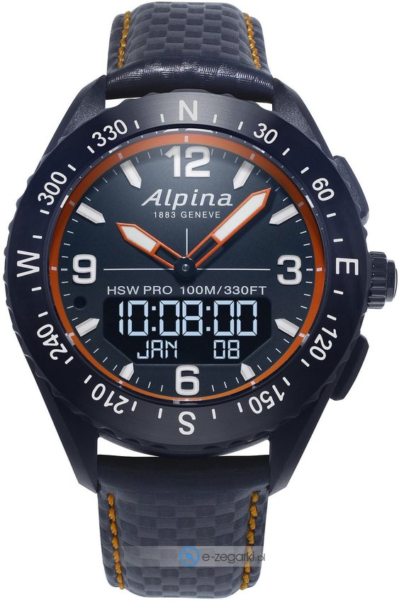 Męski zegarek AL-283LNO5NAQ6L z serii Alpina AlpinerX marki Alpina to połączenie stylu oraz ciekawych mechanizmów. Charakterystyczny wygląd zegarka uzyskano także dzięki tarczy w kolorze niebieskim. Aktualna godzina zaprezentowana jest w sposób analogowo - cyfrowy co niezmiernie łatwo pozwala ją odczytać. Koperta szeroka jest na 45 mm - posiada okrągły kształt.