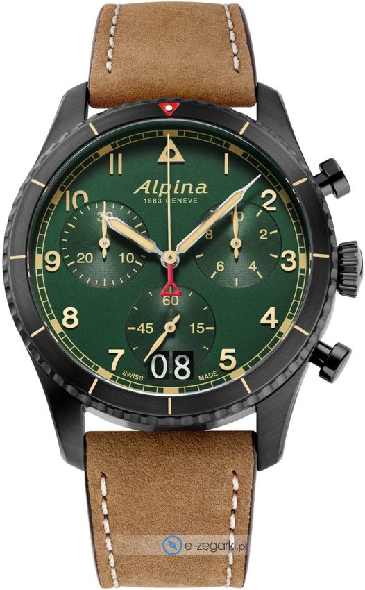 Zegarek AL-372GR4FBS26 marki Alpina to stylowy zegarek naręczny męski, który posiada pomysłowe rozwiązania i funkcje. Model ten pochodzi z serii Alpina Startimer. Nieschematyczny wygląd czasomierza osiągnięto m.in. poprzez cyferblat w kolorze zielonym. Aktualna godzina prezentowana jest w sposób analogowy co intuicyjnie pozwala ją odczytać. Koperta szeroka jest na 41 mm - wyróżnia się okrągłym kształtem.
