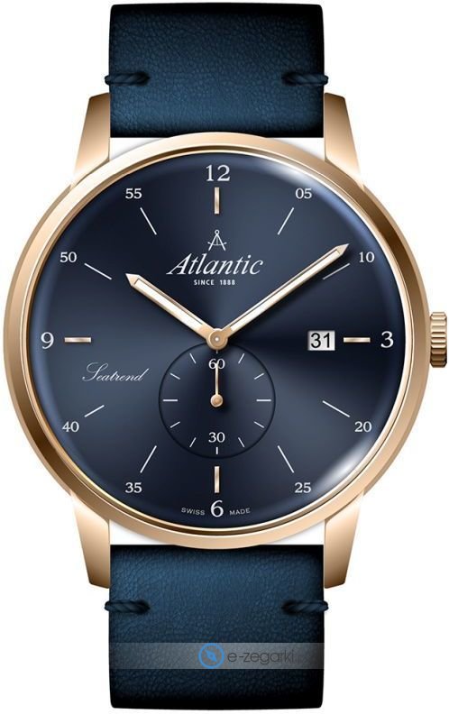 Zegarek męski 65353.44.55 marki Atlantic to idealne połączenie funkcjonalności oraz ciekawego wzornictwa. Charakterystyczny wygląd czasomierza osiągnięto m.in. poprzez tarczę w kolorze niebieskim. Zegarek ten pokazuje godzinę w formacie analogowym dzięki czemu odczyt jest bardzo łatwy. Koperta jest ozdobiona kolorem różowo złotym szeroka jest na 42 mm oraz ma grubość 10 mm - cechuje się okrągłym kształtem.