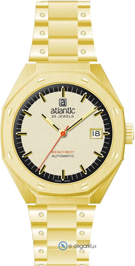 Zegarek męski 58765.45.31 marki Atlantic to stylowe połączenie funkcjonalności i ciekawego wzornictwa. Model ten należy do serii Atlantic Beachboy. Charakteru dodaje wysokiej jakości tarcza w kolorze złotym. Zaprezentowana metodą analogową bieżąca godzina jest czytelna i łatwa do odczytania. Koperta jest ozdobiona kolorem złotym szeroka jest na 40 mm oraz ma grubość 12 mm - w kształcie okrągłym.