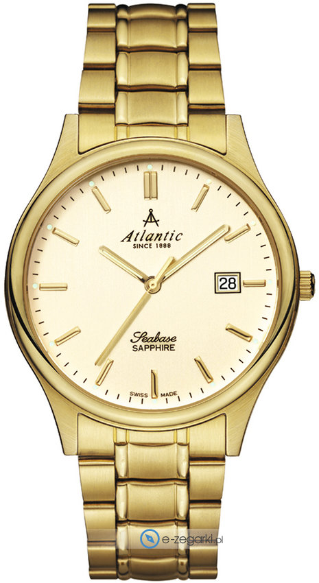 Zegarek męski 60347.45.91 marki Atlantic z serii Atlantic Seabase. Charakteru nadaje wysokiej klasy tarcza w kolorze złotym. Zegarek ten pokazuje aktualny czas w formacie analogowym dzięki temu odczyt jest bardzo łatwy. Koperta została pokryta kolorem złotym szeroka jest na 40 mm oraz ma grubość 8 mm - cechuje się okrągłym kształtem.