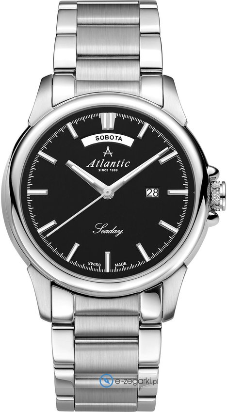 Zegarek męski 69555.41.61P z rodziny Atlantic Seaday marki Atlantic. Ciekawy wygląd czasomierza uzyskano m.in. poprzez tarczę w kolorze czarnym. Zaprezentowana metodą analogową bieżąca godzina jest czytelna i szybka do sprawdzenia. Koperta została ozdobiona kolorem srebrnym szeroka jest na 42 mm oraz ma grubość 12 mm - ma okrągły kształt.