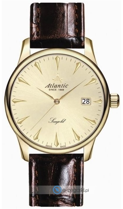 Koperta w tym modelu została wykonana z 14-karatowego złota (próba 585).Męski zegarek 95343.65.31 z serii Atlantic Seagold marki Atlantic to połączenie estetyki i nowatorskich mechanizmów. Atrakcyjny wygląd zegarka uzyskano także dzięki tarczy w kolorze złotym. Zaprezentowana metodą analogową bieżąca godzina jest czytelna i szybka do sprawdzenia. Koperta została ozdobiona kolorem złotym szeroka jest na 38 mm oraz ma grubość 6 mm - w kształcie okrągłym.