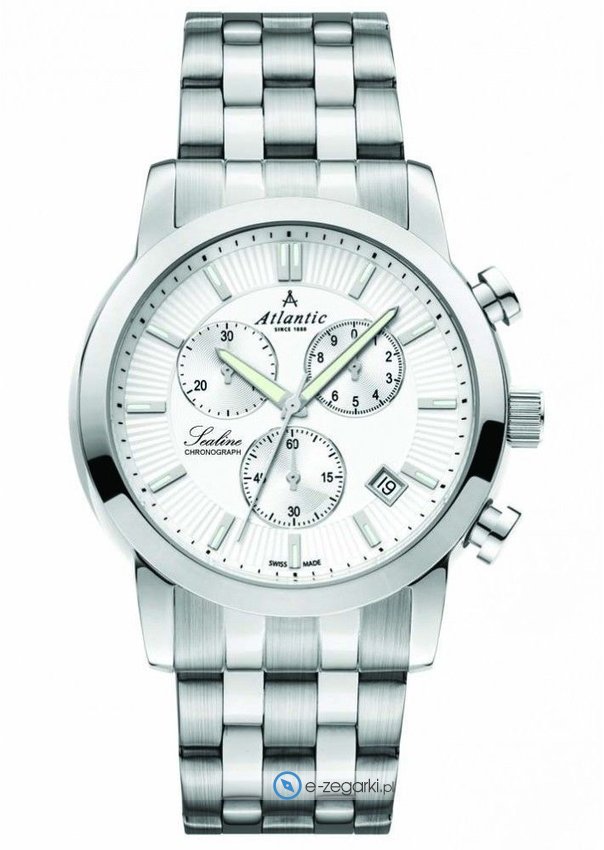 Zegarek męski 62455.41.21 marki Atlantic należy do serii Atlantic Sealine. Charakterystyczny wygląd zegarka osiągnięto m.in. poprzez tarczę w kolorze srebrnym. Godzina prezentowana jest w sposób analogowy co intuicyjnie pozwala ją odczytać. Koperta została pokryta kolorem srebrnym szeroka jest na 45 mm oraz ma grubość 12 mm - w kształcie okrągłym.