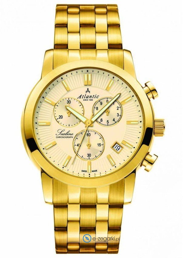 Model męski 62455.45.31 zalicza się do rodziny Atlantic Sealine marki Atlantic. Tarcza zegarka w kolorze złotym. Zegarek ten pokazuje aktualny czas w formacie analogowym dzięki czemu odczyt jest bezproblemowy. Koperta jest w kolorze złotym szeroka jest na 45 mm oraz ma grubość 12 mm - ma okrągły kształt.